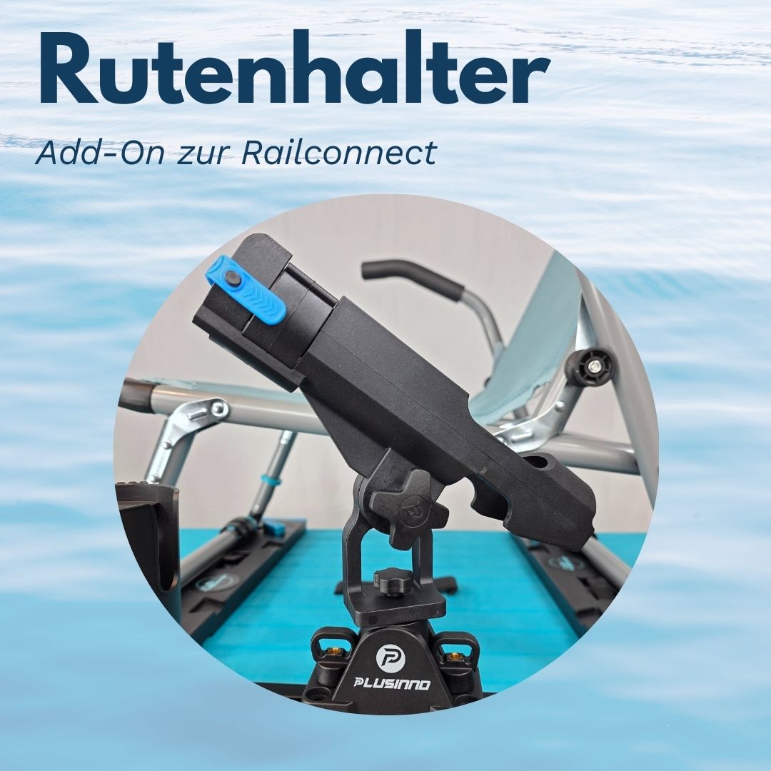Der Angelrutenhalter lässt sich einfach auf die Schiene der Railconnect schieben und werkzeugfrei mit den Schrauben per Hand fixieren. Die Route wird oben eingelegt und per Gummizug gesichert, flexibel einstellbar durch 360° Rotation und 270° Neigung.